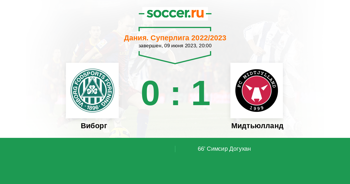 Дания. Суперлига 02.10.2022 Мидтьюлланд Логотип футбольный клуб Мидтьюлланд (Хернинг) 1:1 Логотип футбольный клуб Виборг Виборг