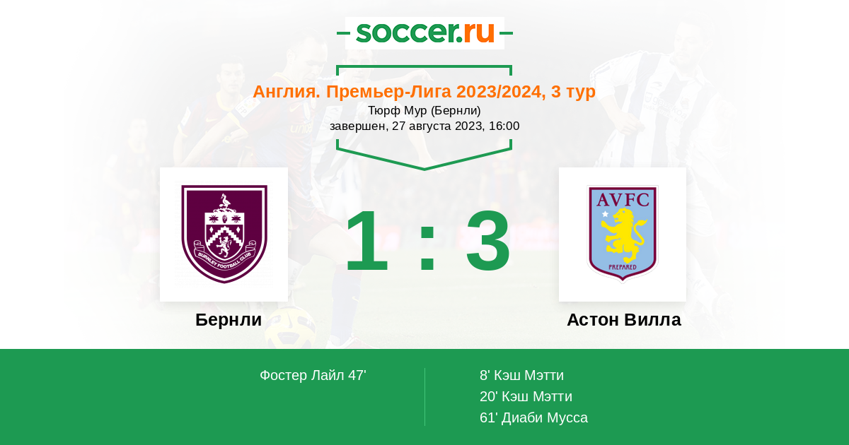 Англия. Премьер-Лига 30.12.2023 Астон Вилла Логотип футбольный клуб Астон Вилла (Бирмингем) 3:2 Логотип футбольный клуб Бернли Бернли