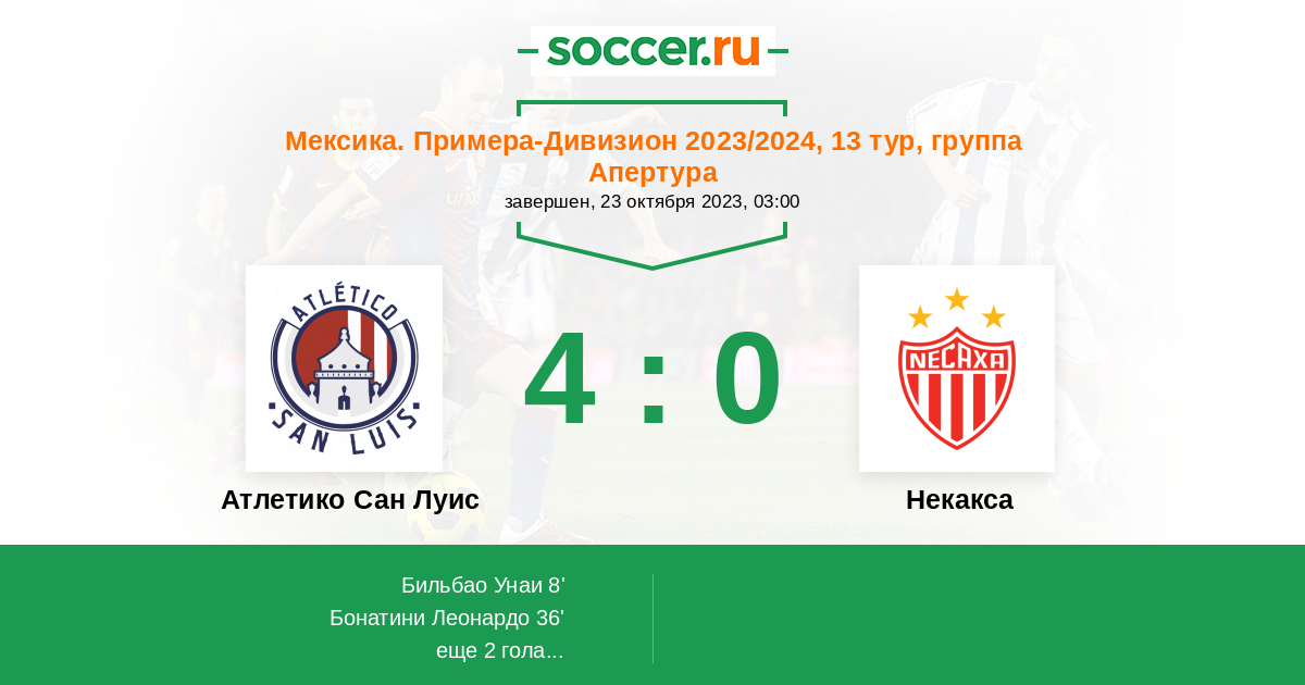 Мексика. Примера-Дивизион 09.03.2024 Некакса Логотип футбольный клуб Некакса (Агуаскальентес) 3:1 Логотип футбольный клуб Атлетико Сан Луис (Сан-Луис-Потоси) Атлетико Сан Луис