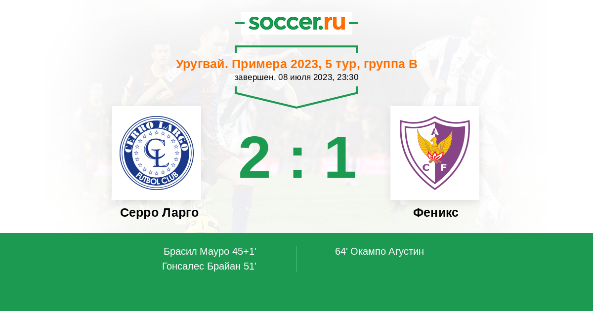 Уругвай. Примера A 03.04.2022 Феникс Логотип футбольный клуб Феникс (Монтевидео) 2:0 Логотип футбольный клуб Серро Ларго (Мело) Серро Ларго