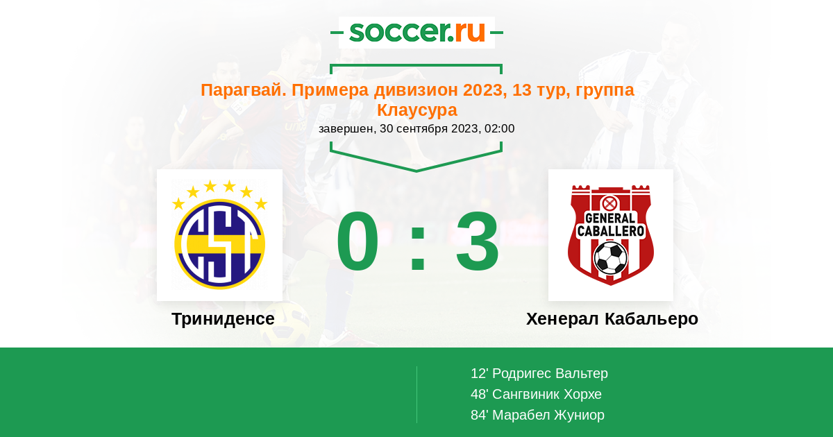 Парагвай. Второй дивизион 31.07.2021 Триниденсе Логотип футбольный клуб Триниденсе (Асунсьон) 1:0 Логотип футбольный клуб Хенерал Кабальеро (Доктор-Хуан-Леон-Майоркин) Хенерал Кабальеро