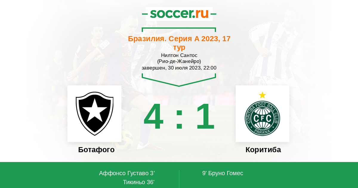 Бразилия. Серия А 18.09.2022 Ботафого Логотип футбольный клуб Ботафого (Рио-де-Жанейро) 2:0 Логотип футбольный клуб Коритиба Коритиба
