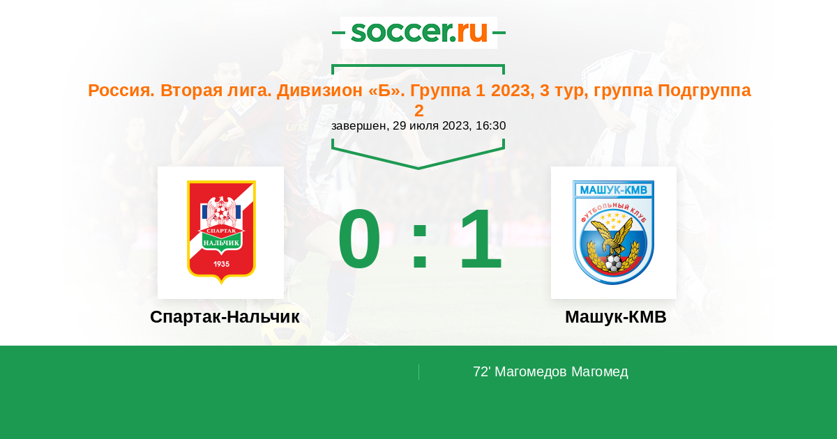 Россия. Вторая лига. Дивизион «Б». Группа 1 08.09.2023 Машук-КМВ Логотип футбольный клуб Машук-КМВ (Пятигорск) 0:2 Логотип футбольный клуб Спартак-Нальчик Спартак-Нальчик