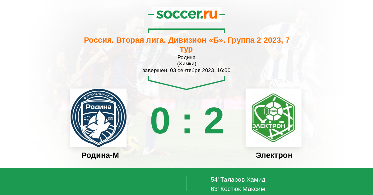 Россия. Вторая лига. Группа 2 07.10.2022 Родина-М Логотип футбольный клуб Родина-М (Москва) 3:1 Логотип футбольный клуб Электрон (Великий Новгород) Электрон