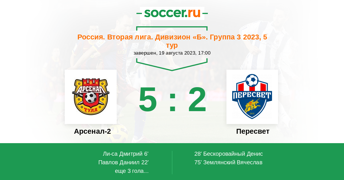 Россия. Вторая лига. Группа 3 10.08.2022 Пересвет Логотип футбольный клуб Пересвет (Домодедово) 2:4 Логотип футбольный клуб Арсенал-2 (Тула) Арсенал-2
