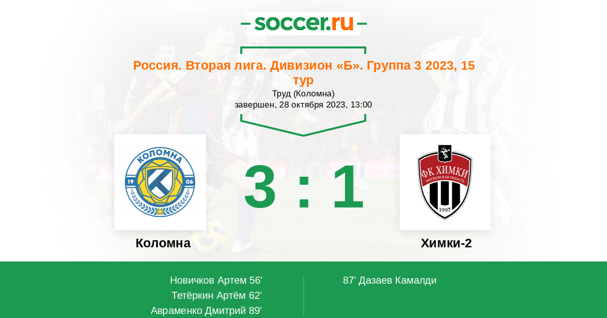 Россия. Вторая лига. Дивизион «Б». Группа 3 13.10.2024 Химки-2 Логотип футбольный клуб Химки-2 3:1 Логотип футбольный клуб Коломна Коломна