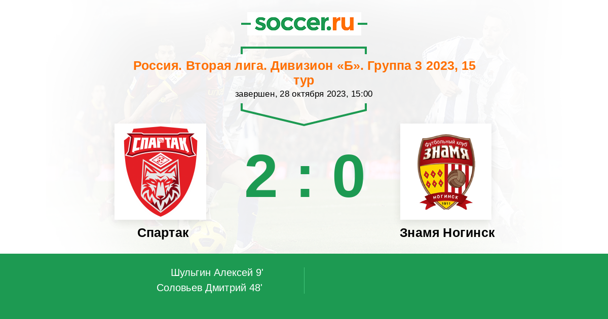 Россия. Вторая лига. Группа 3 04.06.2023 Спартак Логотип футбольный клуб Спартак (Тамбов) 1:2 Логотип футбольный клуб Знамя Ногинск Знамя Ногинск