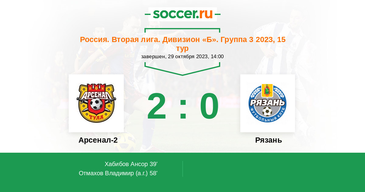 Россия. Вторая лига. Группа 3 30.09.2021 Рязань Логотип футбольный клуб Рязань 1:0 Логотип футбольный клуб Арсенал-2 (Тула) Арсенал-2