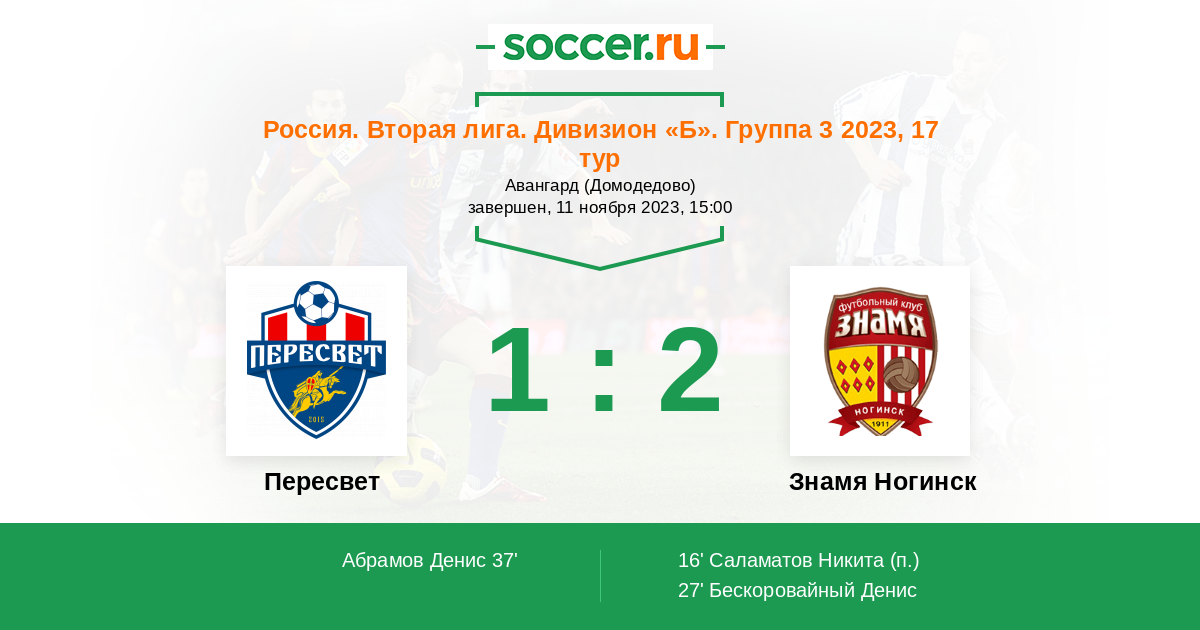 Россия. Вторая лига. Группа 3 25.10.2021 Пересвет Логотип футбольный клуб Пересвет (Домодедово) 2:1 Логотип футбольный клуб Знамя Ногинск Знамя Ногинск
