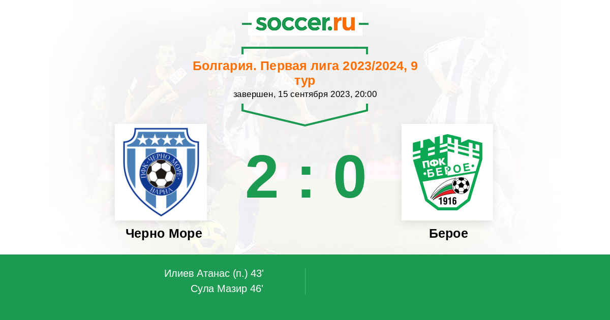 Болгария. Первая лига 19.09.2020 Берое Логотип футбольный клуб Берое (Стара-Загора) 4:0 Логотип футбольный клуб Черно Море (Варна) Черно Море