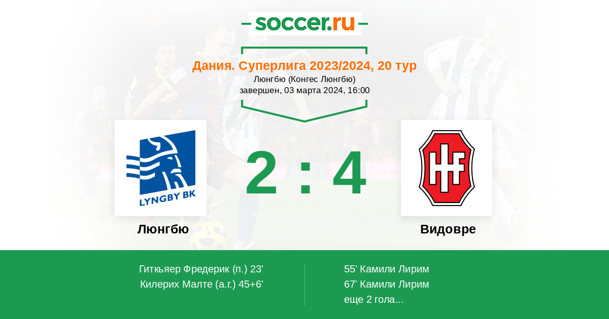Дания. Суперлига 14.04.2024 Люнгбю Логотип футбольный клуб Люнгбю (Конгес Люнгбю) 1:1 Логотип футбольный клуб Видовре Видовре