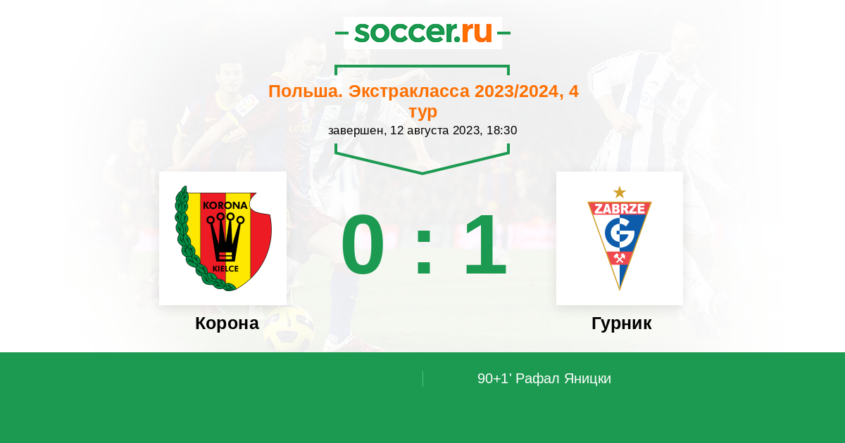 Польша. Экстракласса 15.08.2014 Корона Логотип футбольный клуб Корона (Кельце) 0:3 Логотип футбольный клуб Гурник (Забже) Гурник