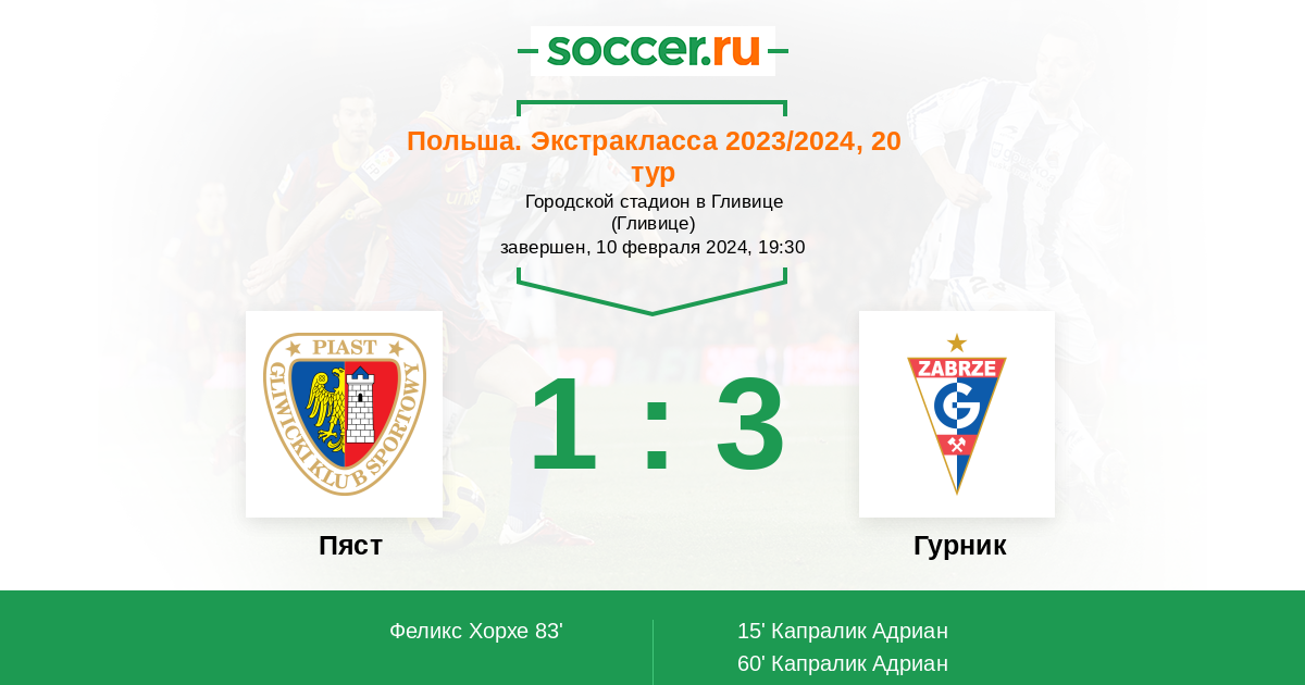 Польша. Экстракласса 31.03.2023 Пяст Логотип футбольный клуб Пяст (Гливице) 1:0 Логотип футбольный клуб Гурник (Забже) Гурник