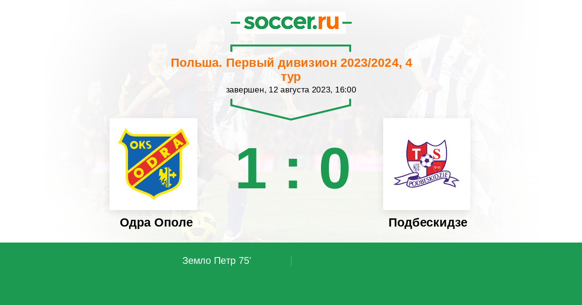 Польша. Первый дивизион 25.07.2022 Одра Ополе Логотип футбольный клуб Одра Ополе 1:2 Логотип футбольный клуб Подбескидзе (Бельско-Бяла) Подбескидзе