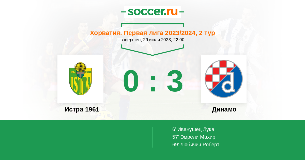 Хорватия. Первая лига 29.07.2022 Динамо Логотип футбольный клуб Динамо (Загреб) 4:1 Логотип футбольный клуб Истра 1961 (Пула) Истра 1961