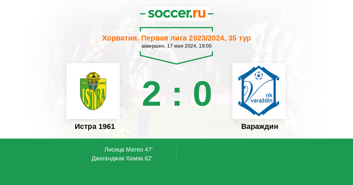 Хорватия. Первая лига 01.12.2023 Истра 1961 Логотип футбольный клуб Истра 1961 (Пула) 2:0 Логотип футбольный клуб Вараждин Вараждин