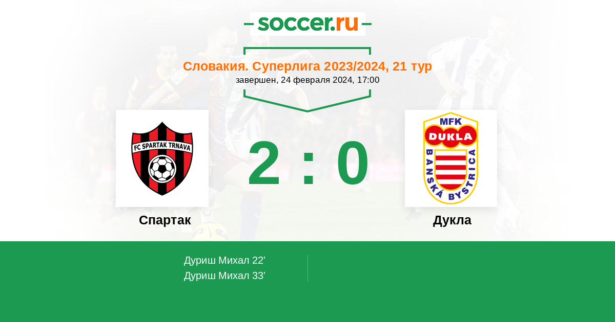 Словакия. Суперлига 08.04.2023 Дукла Логотип футбольный клуб Дукла (Банска-Бистрица) 2:0 Логотип футбольный клуб Спартак (Трнава) Спартак