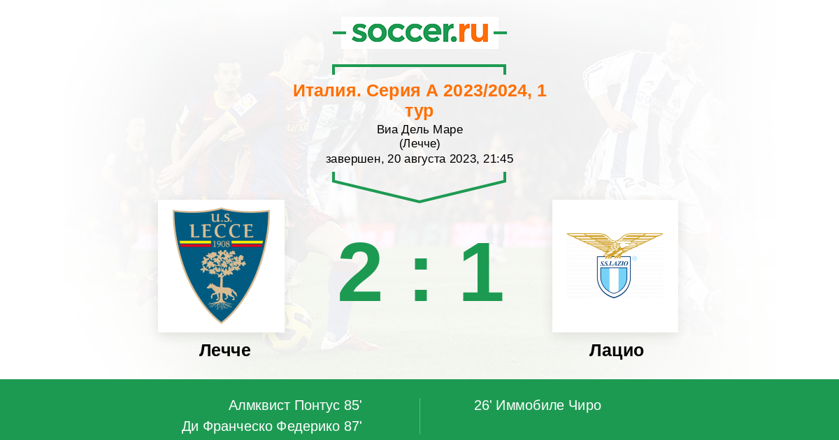 Италия. Серия А 12.05.2023 Лацио Логотип футбольный клуб Лацио (Рим) 2:2 Логотип футбольный клуб Лечче Лечче