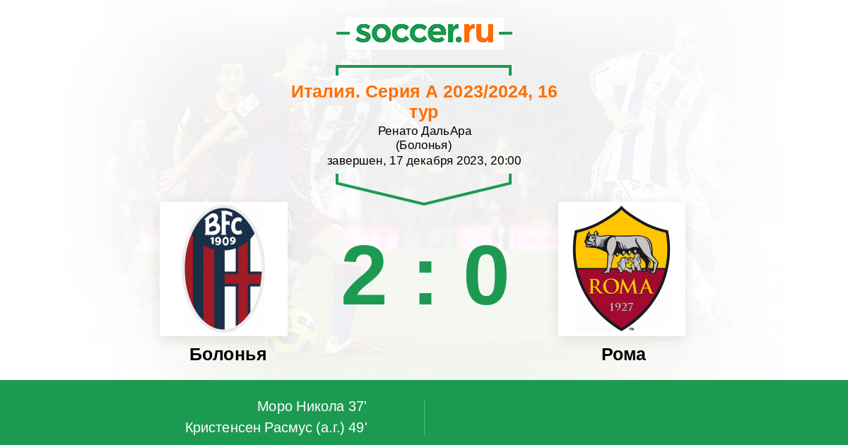 Италия. Серия А 13.12.2020 Болонья Логотип футбольный клуб Болонья 1:5 Логотип футбольный клуб Рома (Рим) Рома