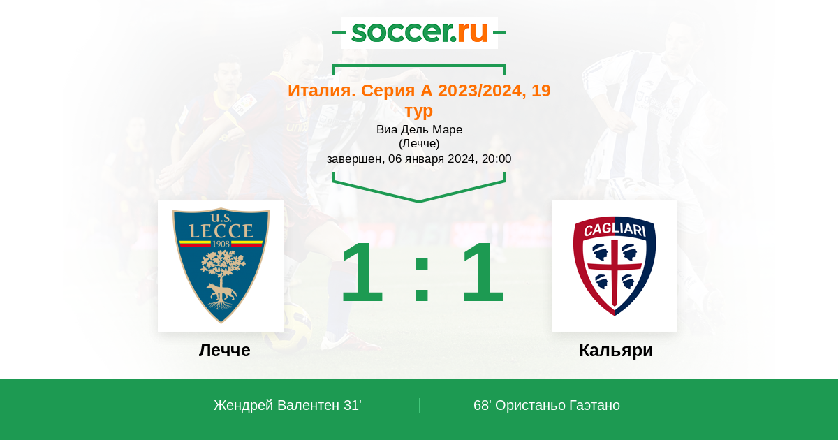 Италия. Серия А 19.01.2025 Кальяри Логотип футбольный клуб Кальяри 4:1 Логотип футбольный клуб Лечче Лечче