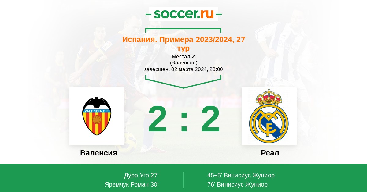 Испания. Примера 21.05.2023 Валенсия Логотип футбольный клуб Валенсия 1:0 Логотип футбольный клуб Реал (Мадрид) Реал