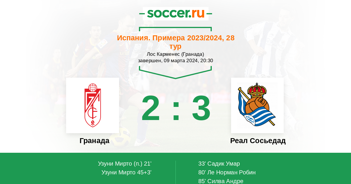 Испания. Примера 14.03.2021 Гранада Логотип футбольный клуб Гранада 1:0 Логотип футбольный клуб Реал Сосьедад (Сан-Себастьян) Реал Сосьедад