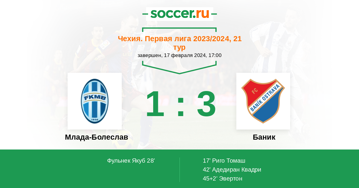 Чехия. Первая Лига 28.08.2021 Баник Логотип футбольный клуб Баник (Острава) 1:0 Логотип футбольный клуб Млада-Болеслав Млада-Болеслав