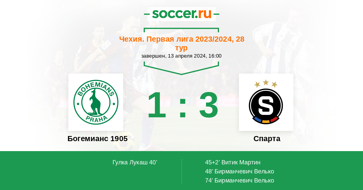 Чехия. Первая Лига 20.05.2023 Спарта Логотип футбольный клуб Спарта (Прага) 2:1 Логотип футбольный клуб Богемианс 1905 (Прага) Богемианс 1905