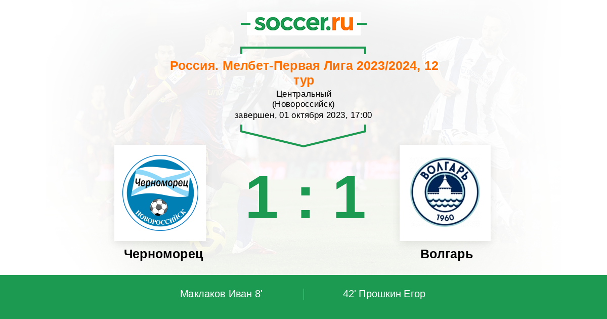 Россия. Вторая лига. Группа 1 22.07.2013 Черноморец Логотип футбольный клуб Черноморец (Новороссийск) 1:1 Логотип футбольный клуб Волгарь (Астрахань) Волгарь