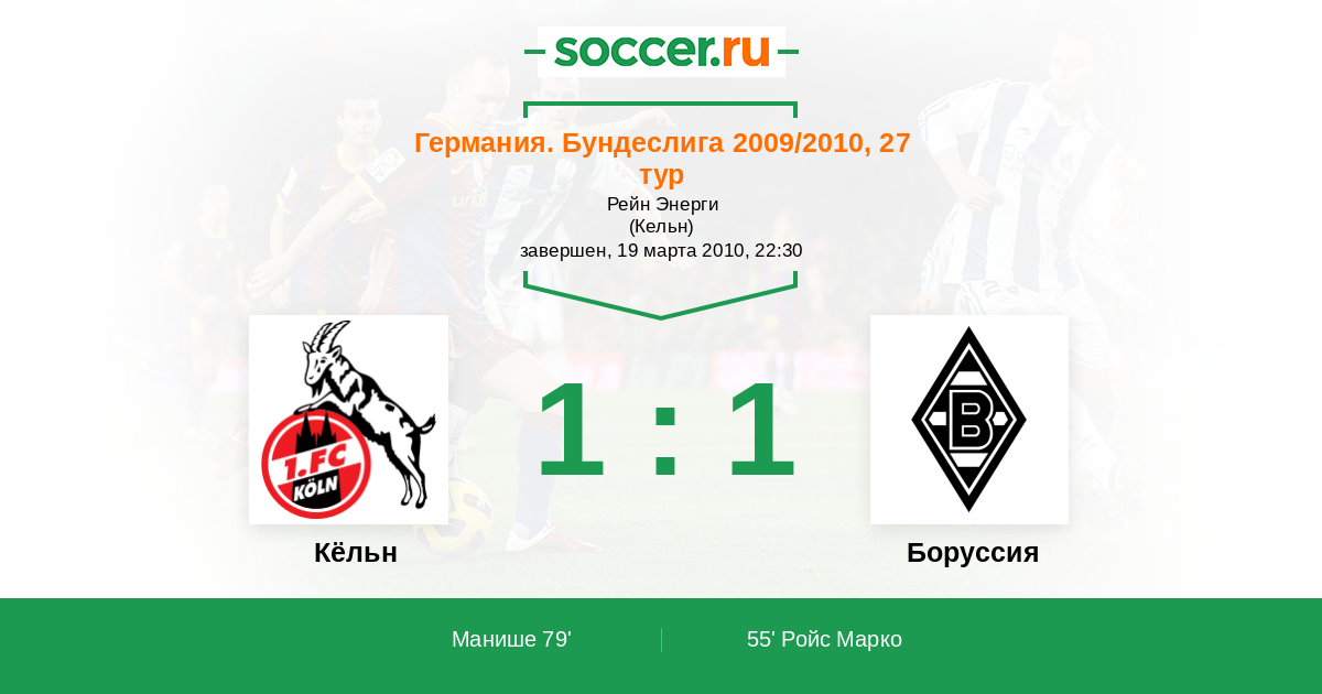 Германия. Бундеслига 24.10.2009 Боруссия Логотип футбольный клуб Боруссия (Менхенгладбах) 0:0 Логотип футбольный клуб Кёльн Кёльн