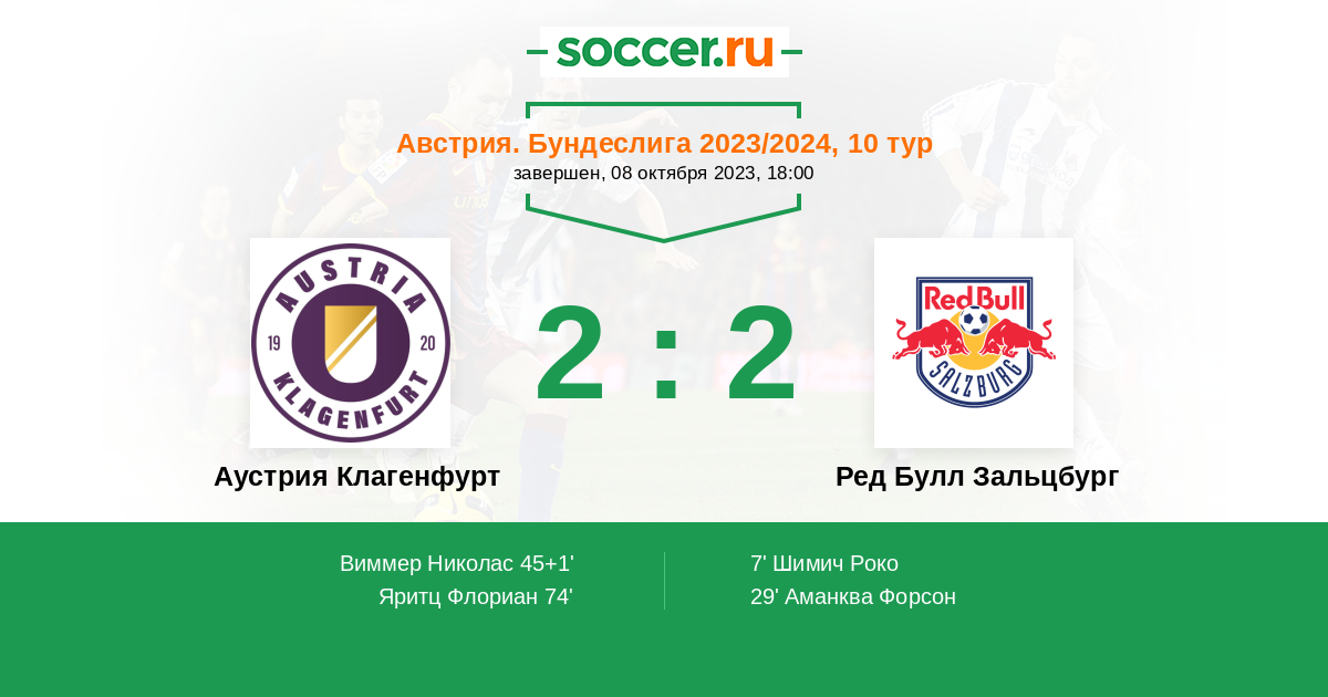 Австрия. Бундеслига 02.04.2023 Аустрия Клагенфурт Логотип футбольный клуб Аустрия Клагенфурт 0:3 Логотип футбольный клуб Ред Булл Зальцбург Ред Булл Зальцбург
