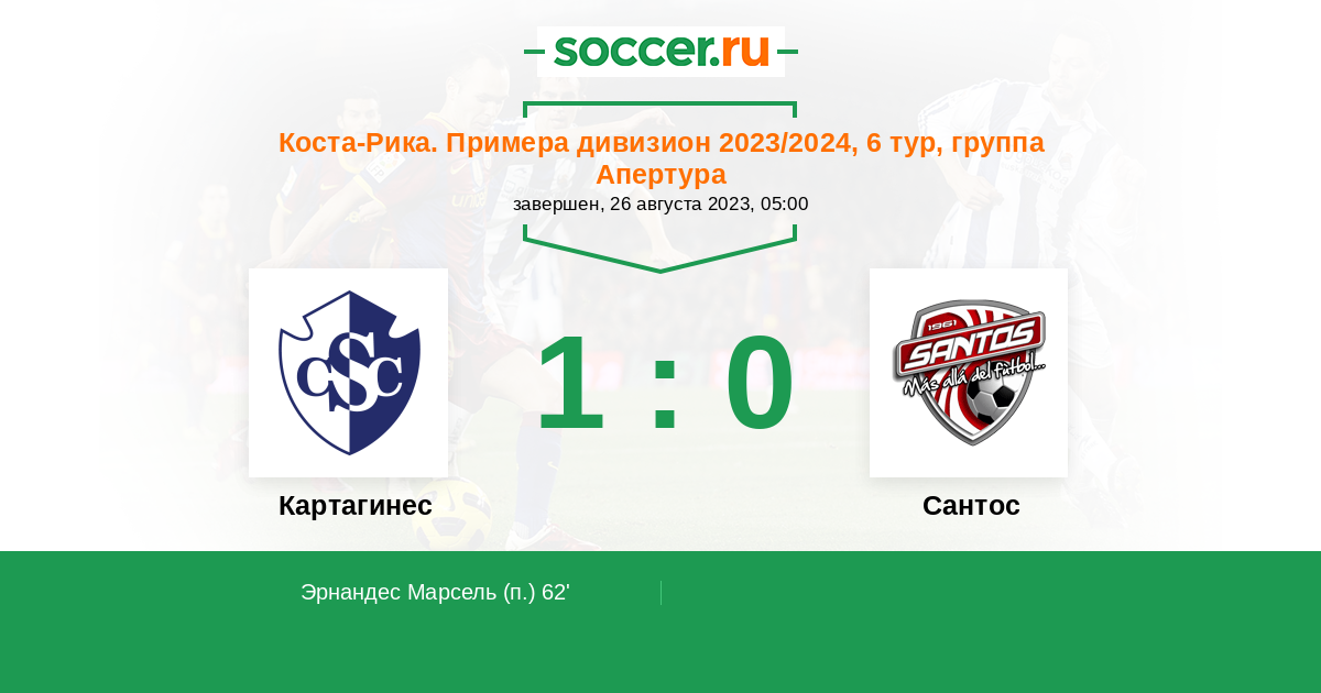 Коста-Рика. Примера дивизион 16.04.2017 Сантос Логотип футбольный клуб Сантос (Гуапилес) 1:0 Логотип футбольный клуб Картахинес (Карфаген) Картахинес