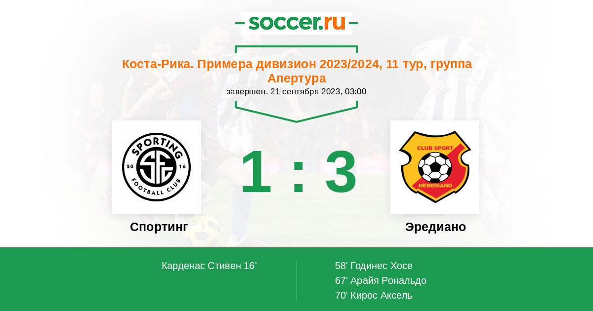 Коста-Рика. Примера дивизион 17.09.2021 Эредиано Логотип футбольный клуб Эредиано 3:0 Логотип футбольный клуб Спортинг Сан-Хосе Спортинг Сан-Хосе