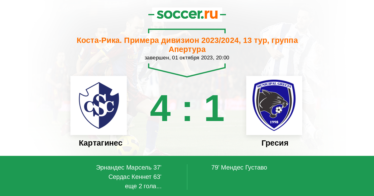 Коста-Рика. Примера дивизион 14.08.2022 Гресия Логотип футбольный клуб Гресия 3:5 Логотип футбольный клуб Картахинес (Карфаген) Картахинес
