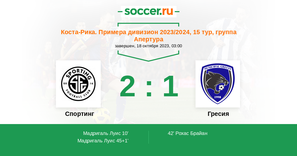 Коста-Рика. Примера дивизион 13.08.2023 Гресия Логотип футбольный клуб Гресия 0:1 Логотип футбольный клуб Спортинг Сан-Хосе Спортинг Сан-Хосе
