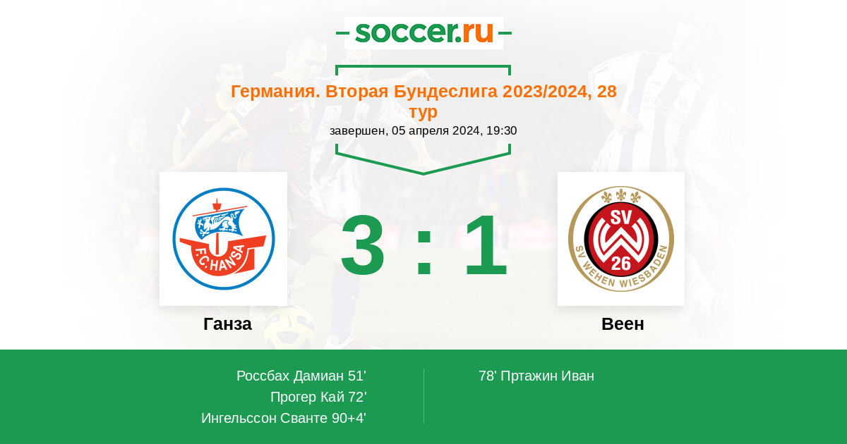 Германия. Третья лига 21.04.2018 Ганза Логотип футбольный клуб Ганза (Росток) 2:0 Логотип футбольный клуб Веен (Висбаден) Веен