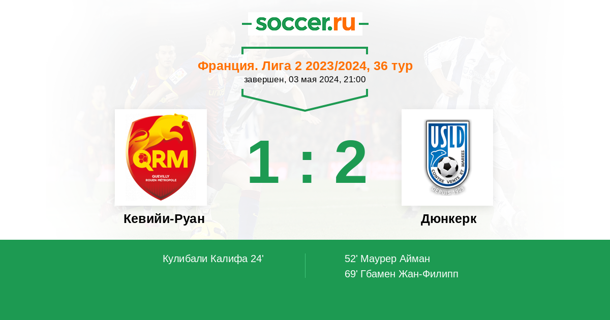 Франция. Насьональ (3-й дивизион) 12.05.2017 Кевийи-Руан Логотип футбольный клуб Кевийи-Руан (Ля-Пети-Кевийи) 2:0 Логотип футбольный клуб Дюнкерк Дюнкерк