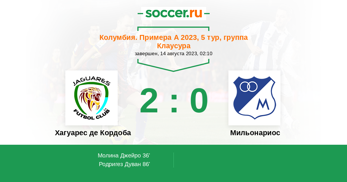 Колумбия. Примера А 19.02.2023 Мильонариос Логотип футбольный клуб Мильонариос (Богота) 2:1 Логотип футбольный клуб Хагуарес де Кордоба (Монтерия) Хагуарес де Кордоба