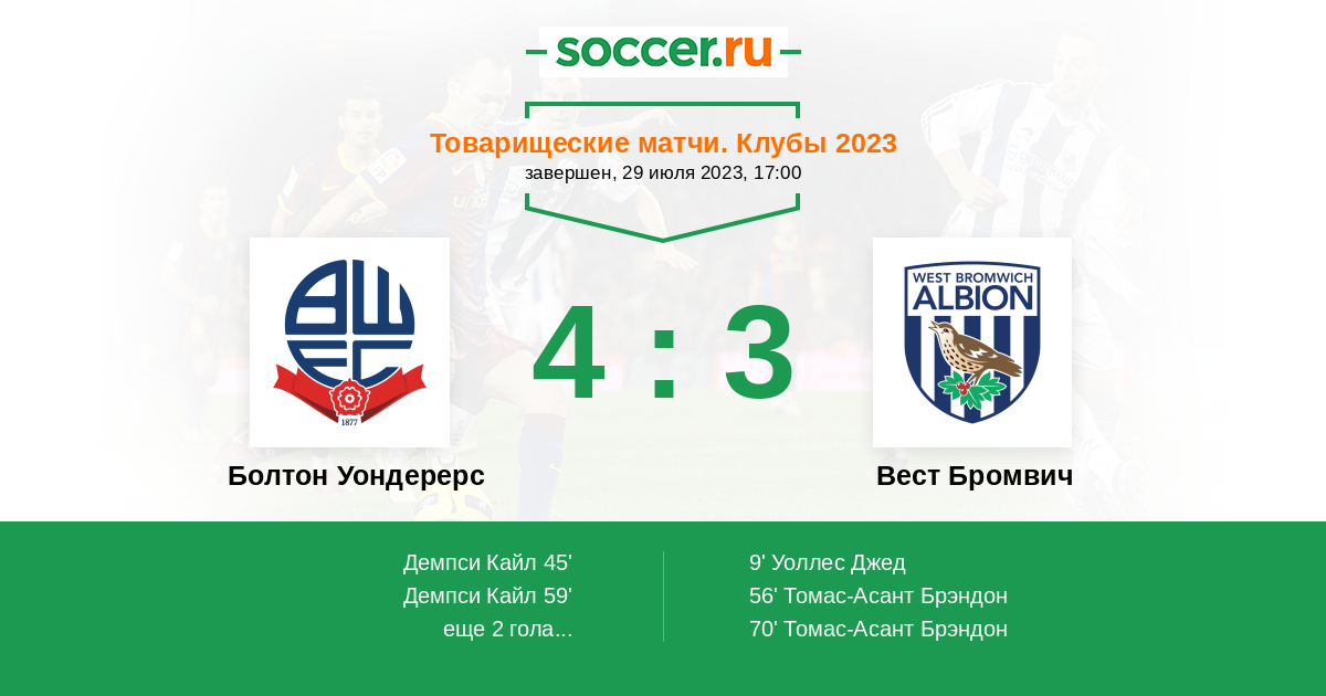 Товарищеские матчи. Клубы 13.07.2024 Вест Бромвич Логотип футбольный клуб Вест Бромвич 1:2 Логотип футбольный клуб Болтон Уондерерс Болтон Уондерерс