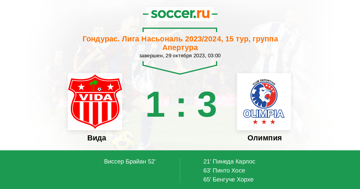 Гондурас. Лига Насьональ 01.04.2024 Олимпия Логотип футбольный клуб Олимпия (Тегусигальпа) 5:1 Логотип футбольный клуб Вида (Ла-Сейба) Вида