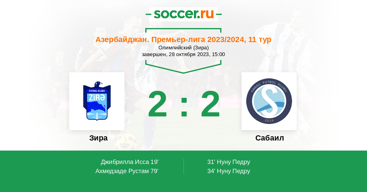 Азербайджан. Премьер-Лига 31.10.2020 Зира Логотип футбольный клуб Зира 0:0 Логотип футбольный клуб Сабаил (Баку) Сабаил