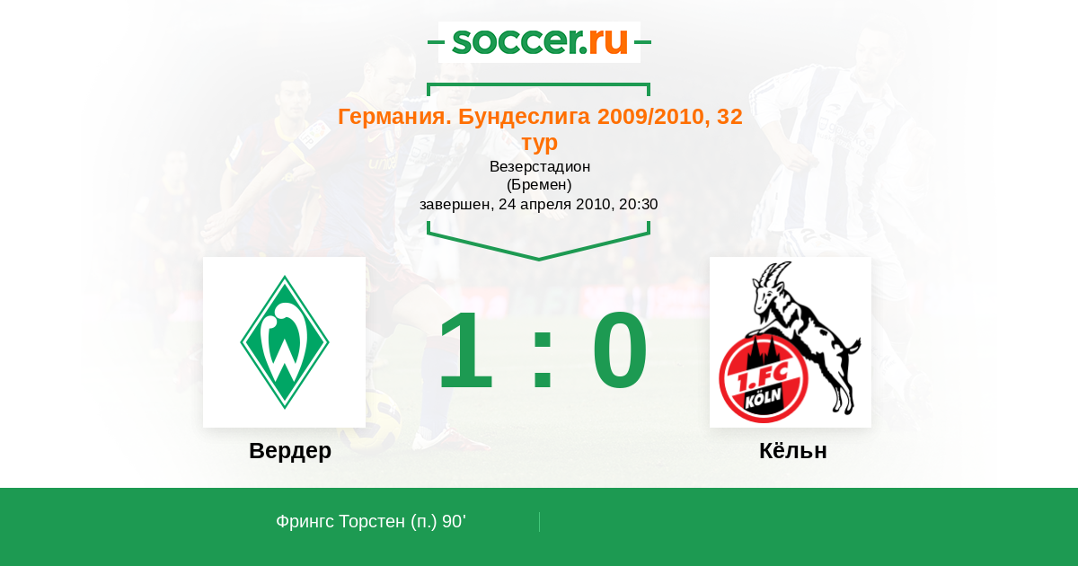 Германия. Бундеслига 28.08.2010 Вердер Логотип футбольный клуб Вердер (Бремен) 4:2 Логотип футбольный клуб Кёльн Кёльн
