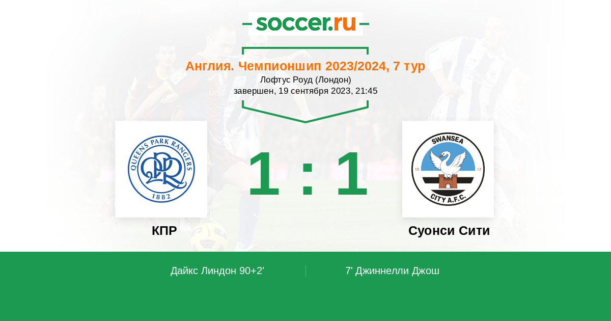 Англия. Чемпионшип 21.01.2023 КПР Логотип футбольный клуб КПР (Лондон) 1:1 Логотип футбольный клуб Суонси Сити Суонси Сити