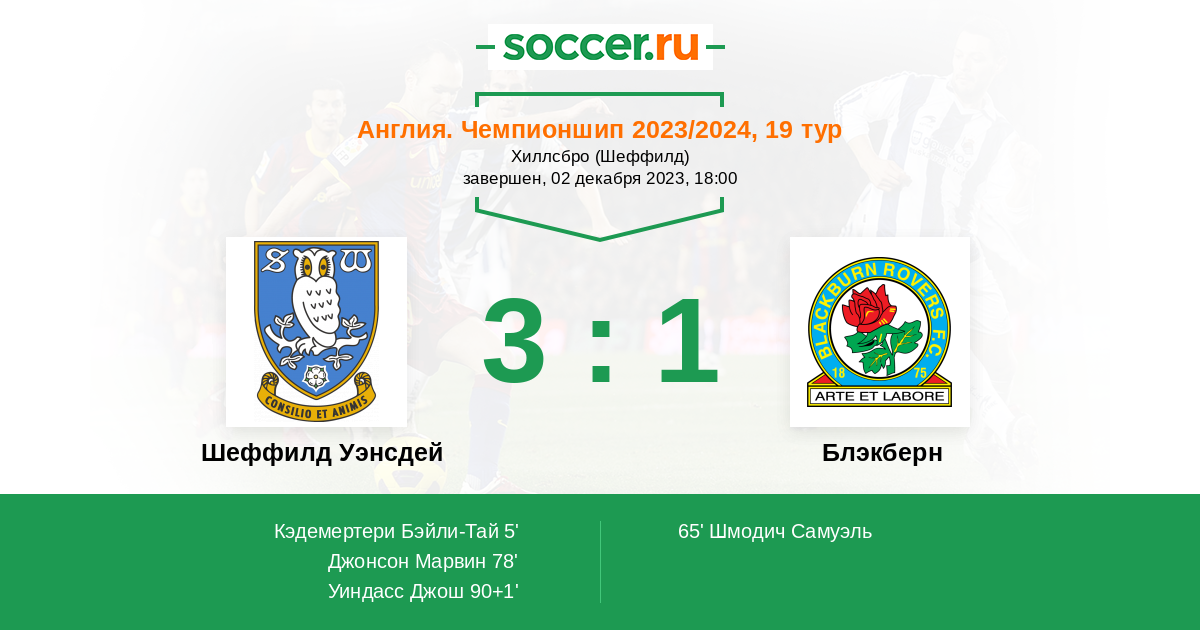 Англия. Чемпионшип 16.03.2019 Шеффилд Уэнсдей Логотип футбольный клуб Шеффилд Уэнсдей 4:2 Логотип футбольный клуб Блэкберн Блэкберн