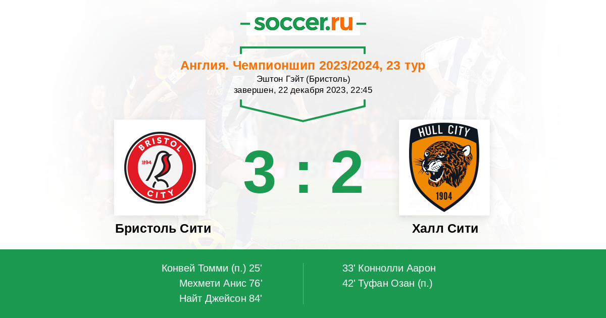 Англия. Чемпионшип 25.02.2023 Бристоль Сити Логотип футбольный клуб Бристоль Сити 1:0 Логотип футбольный клуб Халл Сити (Кингстон-апон-Халл) Халл Сити