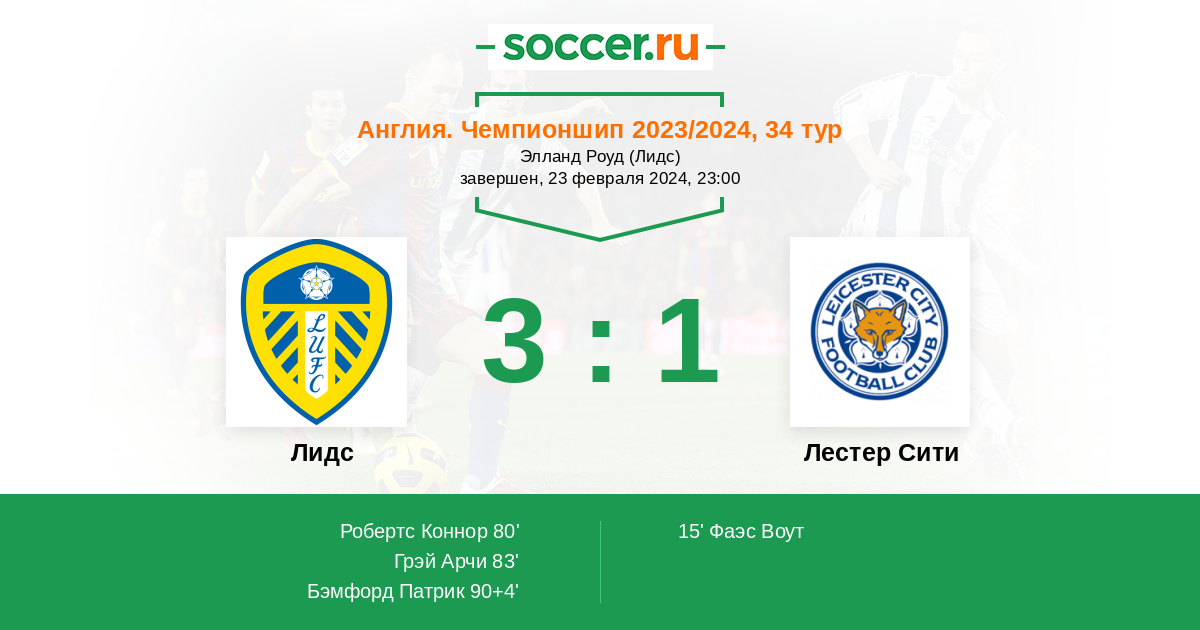 Англия. Чемпионшип 03.11.2023 Лестер Сити Логотип футбольный клуб Лестер Сити 0:1 Логотип футбольный клуб Лидс Лидс