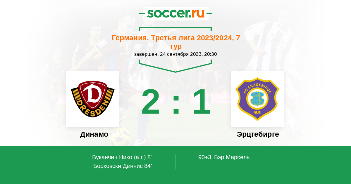 Германия. Третья лига 23.08.2024 Эрцгебирге Логотип футбольный клуб Эрцгебирге (Ауэ) 2:0 Логотип футбольный клуб Динамо (Дрезден) Динамо