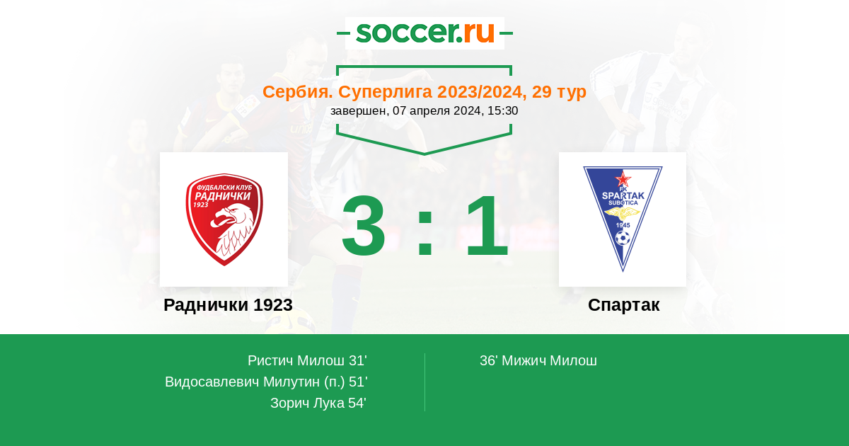 Сербия. Суперлига 06.11.2023 Спартак Суботица Логотип футбольный клуб Спартак Суботица 1:3 Логотип футбольный клуб Раднички 1923 (Крагуевац) Раднички 1923
