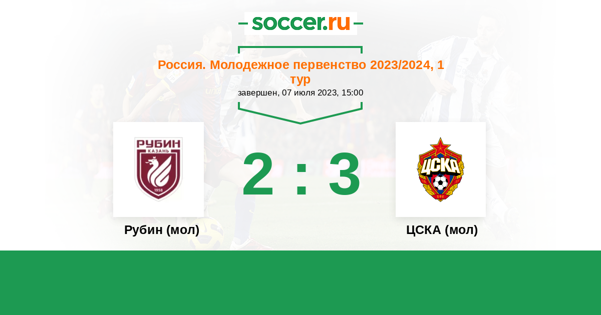 Россия. Премьер-Лига U21 30.07.2021 Рубин (мол) Логотип футбольный клуб Рубин (мол) (Казань) 3:2 Логотип футбольный клуб ЦСКА (мол) (Москва) ЦСКА (мол)