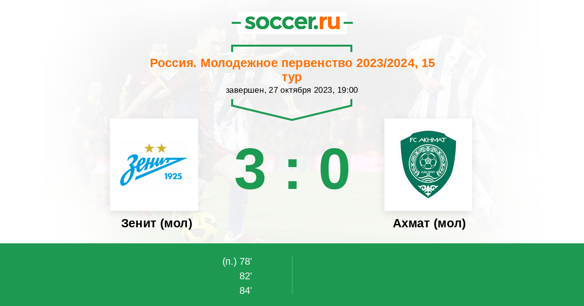 Россия. Премьер-Лига U21 29.03.2024 Зенит (мол) Логотип футбольный клуб Зенит (мол) (Санкт-Петербург) 4:0 Логотип футбольный клуб Ахмат (мол) (Грозный) Ахмат (мол)
